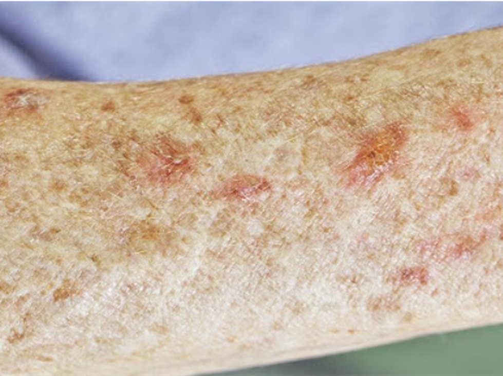 - Trên các vùng da tiếp xúc với ánh nắng mặt trời như vùng đầu, cổ, cánh tay và bàn tay xuất hiện các mảng hay vết sưng mới.