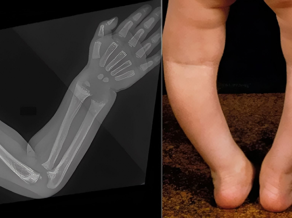 - Các dị tật về xương như hộp sọ có hình dạng kỳ lạ, chân vòng kiềng, có chuỗi hạt sườn còi xương, xương ức bị đẩy về phía trước, dị dạng xương chậu và dị dạng cột sống (cột sống cong bất thường, cong vẹo cột sống).