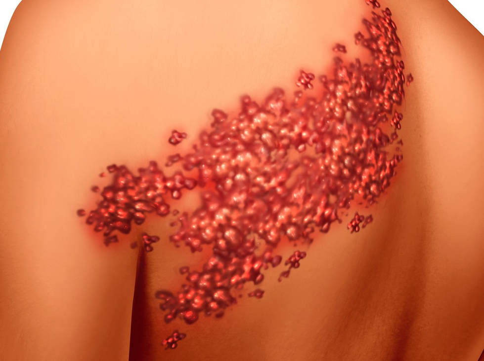 Bệnh zona còn được gọi là herpes zoster. Nhiễm virus này gây đỏ da, nổi mụn nước và cảm giác đau rát nhiều. Bệnh zona thường xuất hiện dưới dạng một dải mụn nước ở một bên cơ thể, điển hình là ở thân, cổ hoặc mặt.