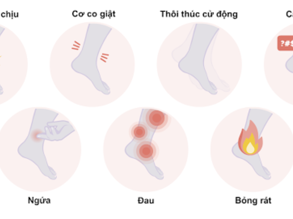 Các triệu chứng chính là cơn đau nhói, căng cơ, tê dần dần, hoặc cảm giác khó chịu khiến bệnh nhân phải di chuyển chân để giảm bớt. Các đặc điểm đi kèm bao gồm: