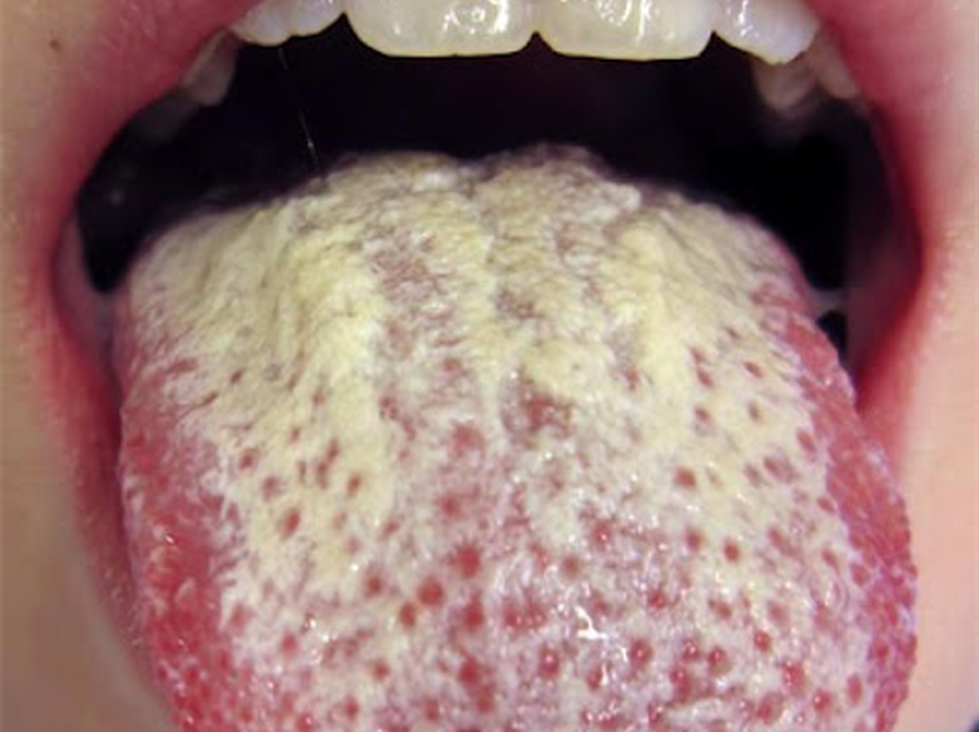 - Các mảng trắng hoặc vàng trên lưỡi, môi, lợi, vòm miệng và má trong;